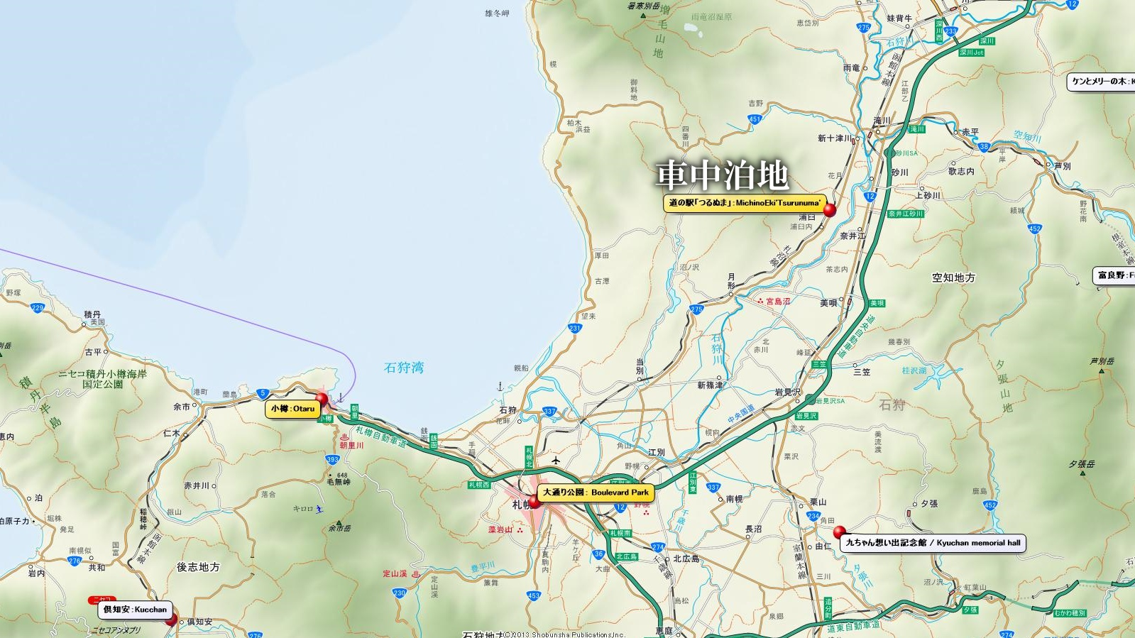 台風一過、札幌駅前が混雑しいて大道り公園で休憩。小樽で昼食(不味かった)、観光し、浦臼町の つるぬまで宿泊。 |