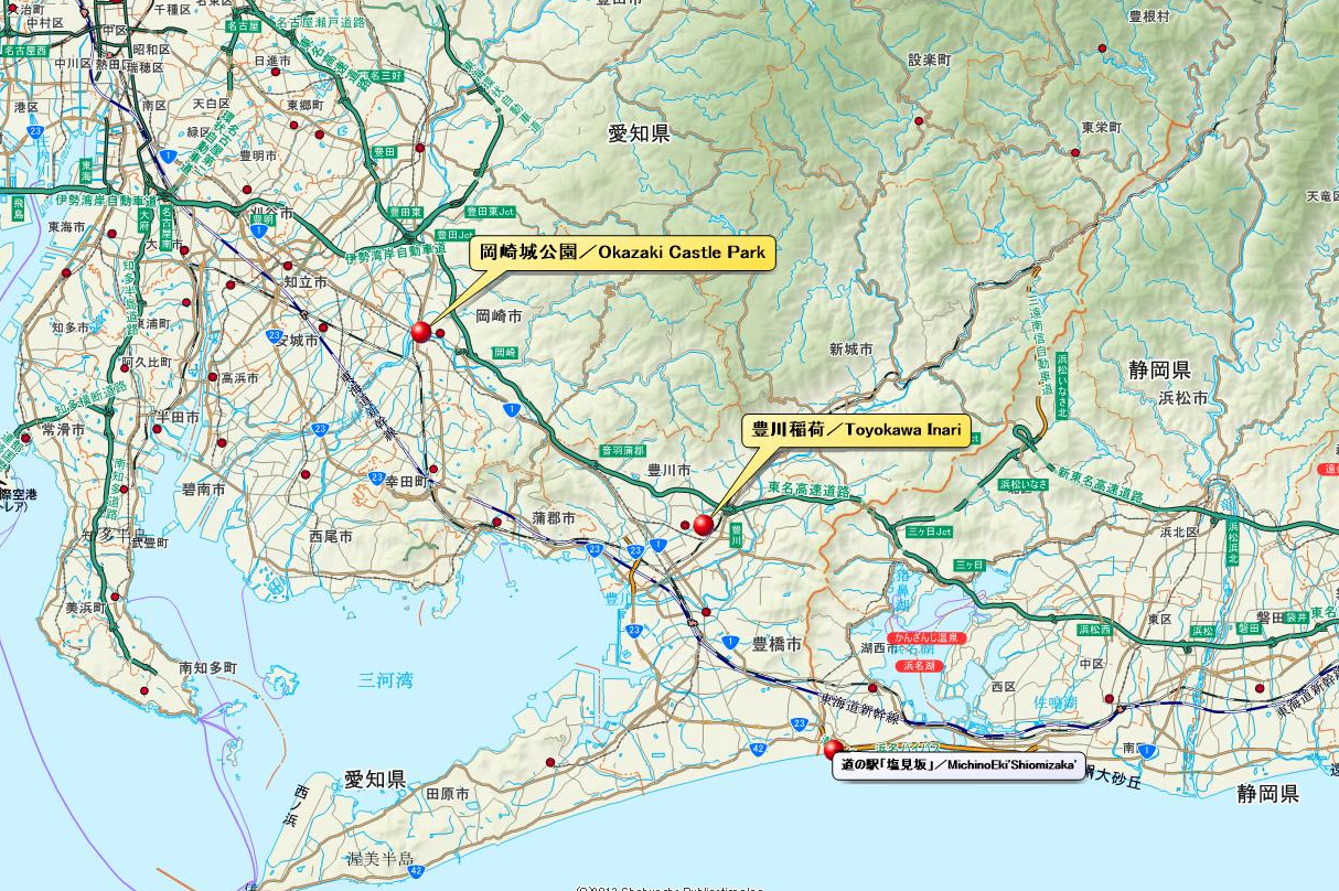 A fox in front of the station. Toyokawa, one color Inari shrine. I was surprised at how many foxes there are. Okazaki Castle is famous as a castle where Tokugawa Ieyasu was born. Here is the history of Ieyasu centered around Okazaki Castle, a shrine, a bronze statue, a historic center and so on.