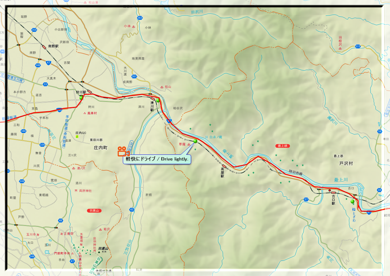 R47:鶴岡街道。最上川と並走。軽快にドライブ。R47: Tsuruoka Highway. Drive parallel to Mogami river. Drive lightly.