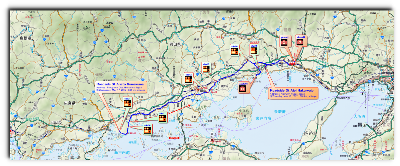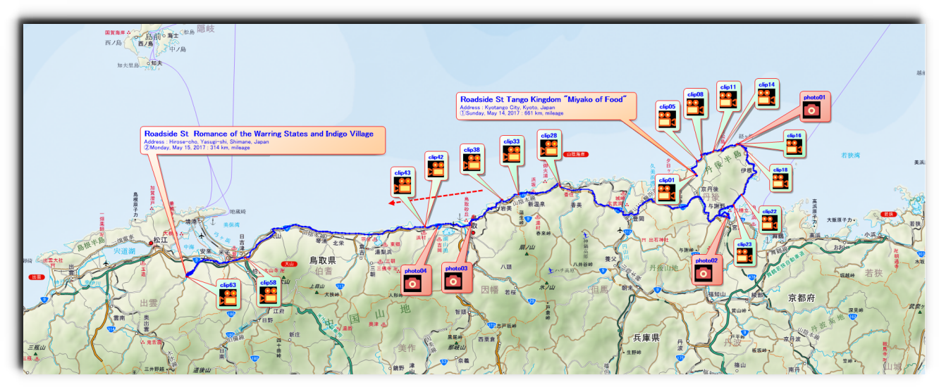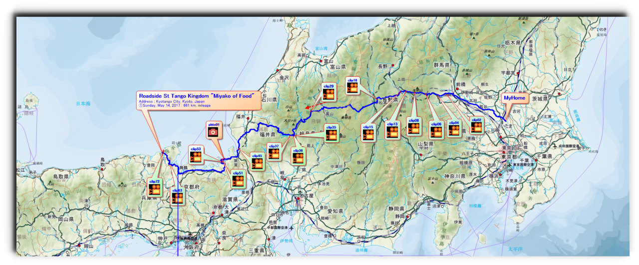 Departing from home early in the morning at 3:00 a.m., i drove from R17 to R158 through Karuizawa, Takayama, Fukui, and Tango, Kyoto, all at once. On the way, i visited Mikata-Goko (Five Lakes of Mikata), took a rest at a convenience store and a roadside station, and arrived at the roadside station where i planned to stay at 7:17 p.m. |