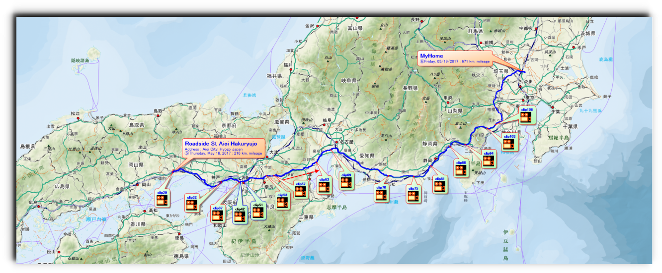 Day 1 (5/14 [Sun]) | 3:00 | | Departure from home (sunny) | | | mileage meter:105,598Km |