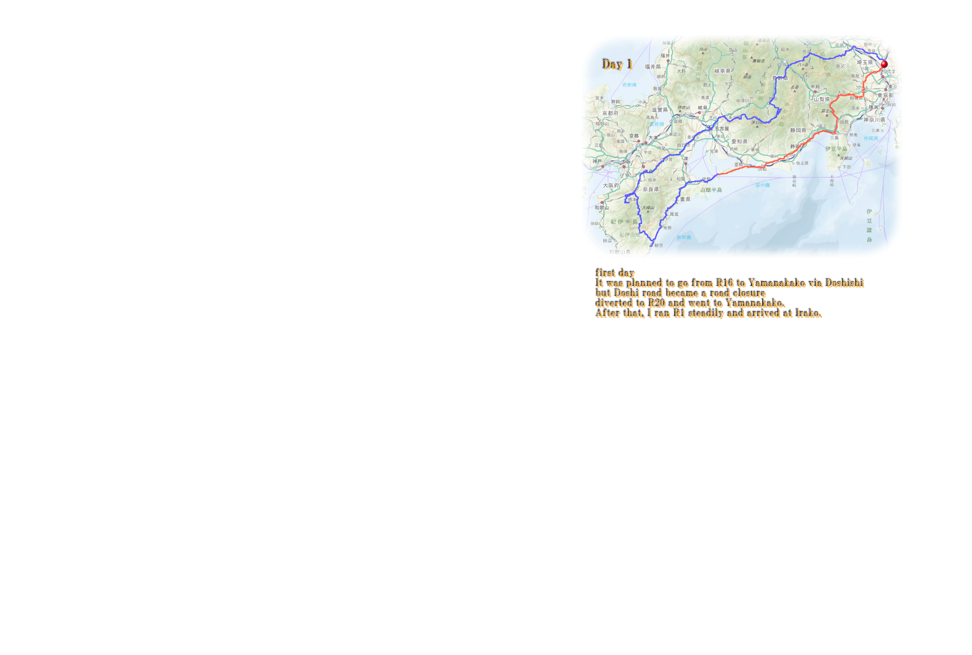 On the way, Dousi road 【R413】 is closed. R412 to R20 to R139 to R138 so far. Break at a small rain lake Yamanaka. |