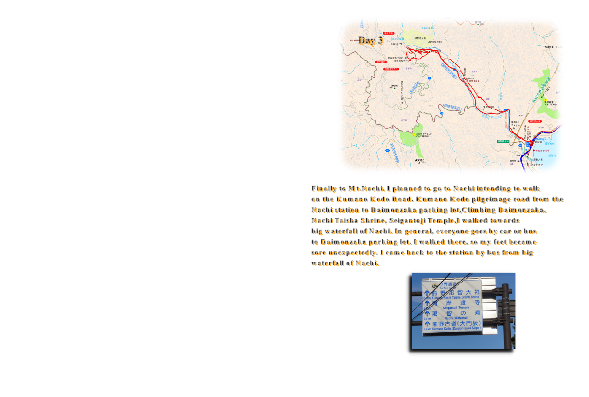 I walk from Nachi station to Daimonzaka parking lot on the Kumano Kodo pilgrimage road. | ||||||