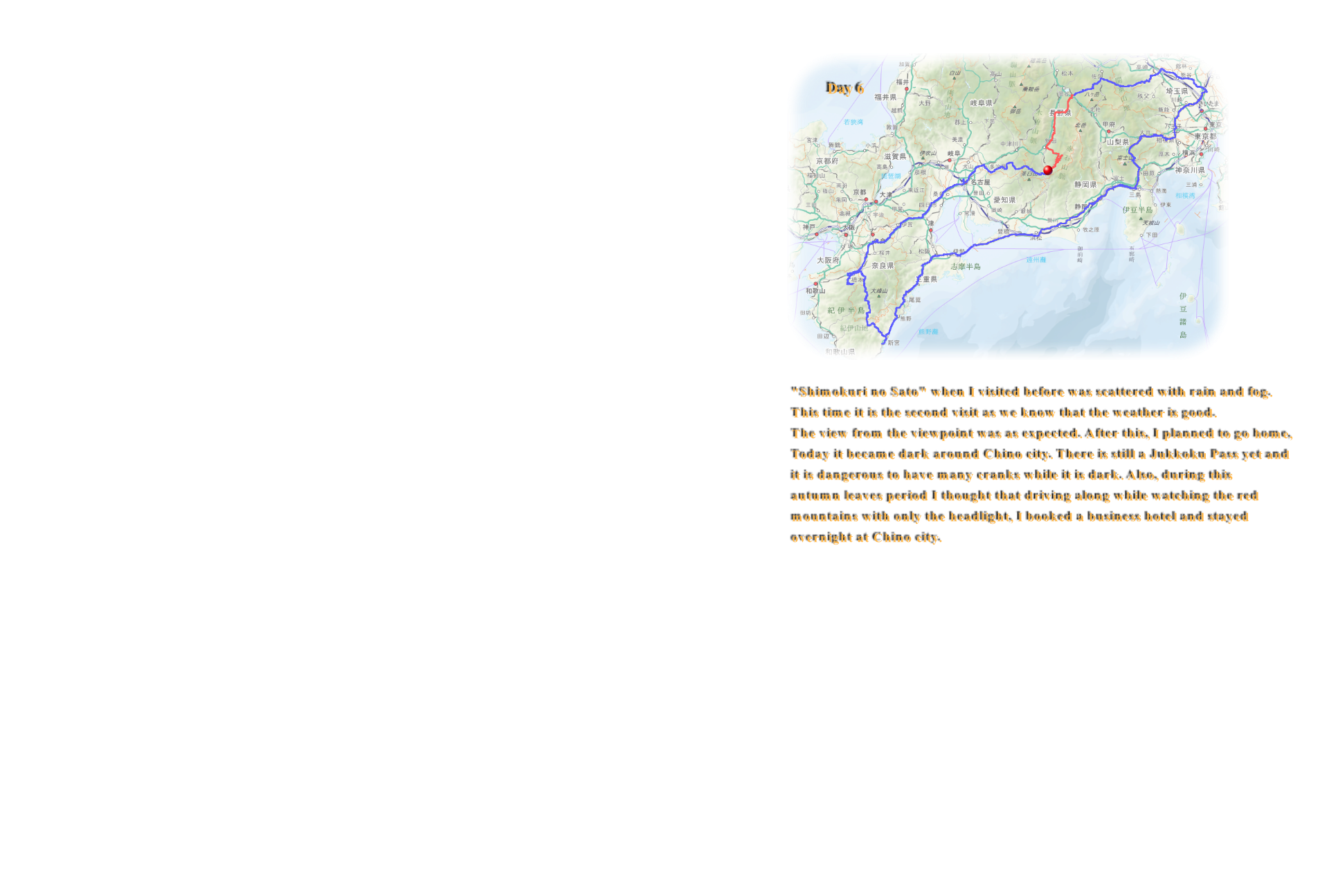 At first, I was planning to go directly from Iida City to my home. However, it got dark in Chino City on the way, and it was dangerous to drive along the mountain pass in the dark, and it would have been a shame not to be able to enjoy the autumn leaves. We decided to stay at a hotel one day longer than we had planned. | ||||||